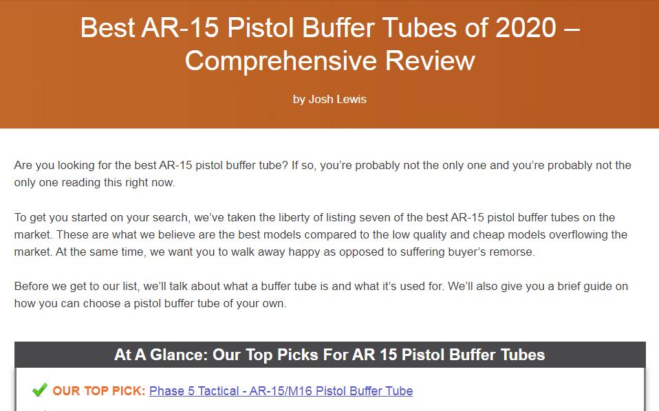 "As expected, the Phase 5 Tactical lives up to the “best overall” title. This is a tough looking unit that provides a good amount of comfort for most shooters, thanks to the additional sleeve. All in all, this buffer tube fits nicely and stays secure on your AR-15 pistol." Josh Lewis, GunMann.com Review