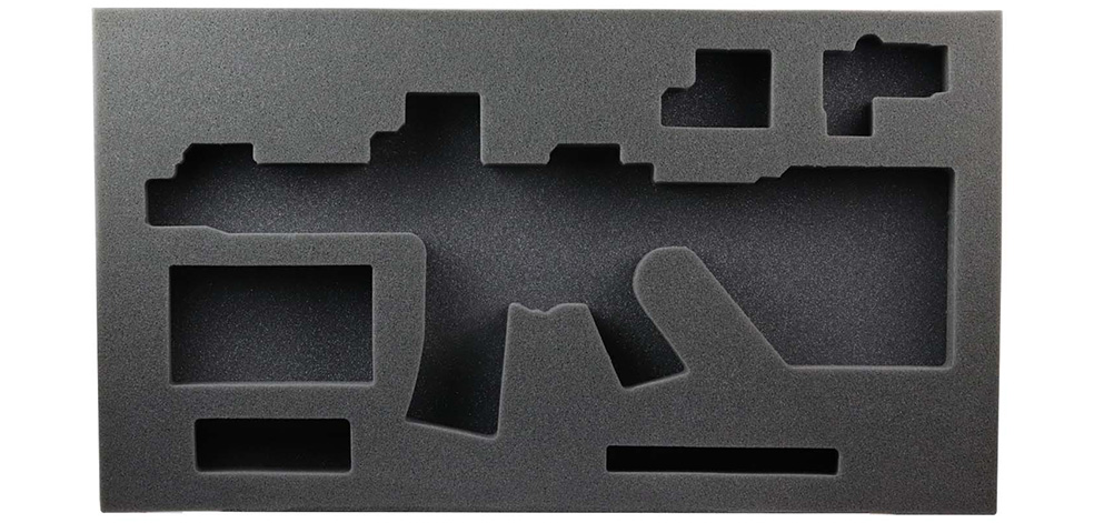 Die cut urethane foam insert for gun case. Fits 7.5" AR Pistols, with or without stabilizing brace. Includes cutouts for EOTech or similar optic plus magnifier, A.R.M.S 71L flip up sight set or similar, and extra spots for magazine and accessories.