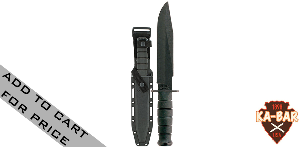 The popular KA-BAR Fighter now with a straight edge. Featuring an 8" 1095 Cro-Van steel blade. Includes black hard plastic sheath.