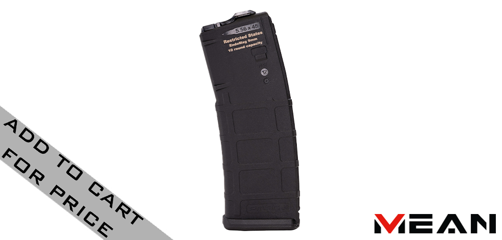 MEAN EndoMag® for Restrictive States. This Restricted State EndoMag® comes already fully assembled in a new (depending on availability could be either a Gen 2 or Gen 3) 5.56/.223 PMAG® housing and is restrictive state compliant as an unmodifiable, 10-round magazine (fixed base plate). If you live in a restricted state that limits magazines to less than standard capacity (30 rounds), you can now utilize your standard AR lower and 9mm upper of your choosing with a Glock or Colt variant 9mm BCG.